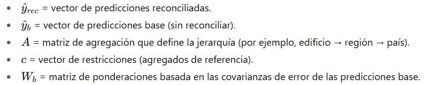 En el marco del proyecto se requirió garantizar que las previsiones a nivel desagregado (serie por inmueble, tipo de coste y país) fuesen coherentes con los niveles agregados (total país, total región y total portfolio). Para este fin se aplicó el método de reconciliación MinT (Minimum Trace) en su variante shrink, considerado un estándar en previsión jerárquica.