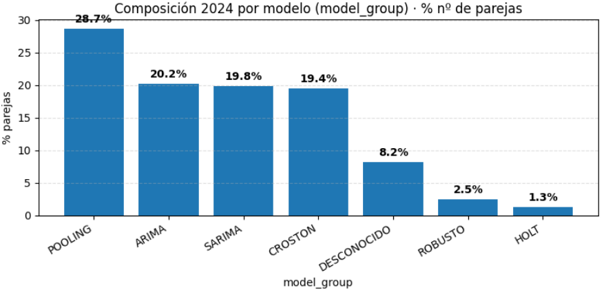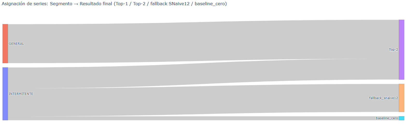 La distribución final nos confirmó el papel central del ensemble Top-2, que concentró el 65 % de las series, convirtiéndose en la solución más robusta y generalizable del pipeline. No obstante, casi un tercio de las series requirieron el fallback SNaive12, lo que demuestra que, pese a la complejidad añadida, la inestabilidad estructural de los datos siguió obligando a apoyarse en este baseline como red de seguridad. El baseline_cero, aplicado en un 4 % de los casos, refleja aquellas series con señal insuficiente para modelizar. La ausencia de resultados en Top-1 en solitario muestra que el proceso de gobernanza y combinación estaba diseñado para priorizar siempre la robustez: o bien reforzando con un Top-2, o bien garantizando cobertura con fallback. En conjunto, la estrategia definida y la regla combo (ver detalle en Anexo 2) lograron un equilibrio entre sofisticación y fiabilidad, asegurando que ninguna serie quedara sin previsión.
