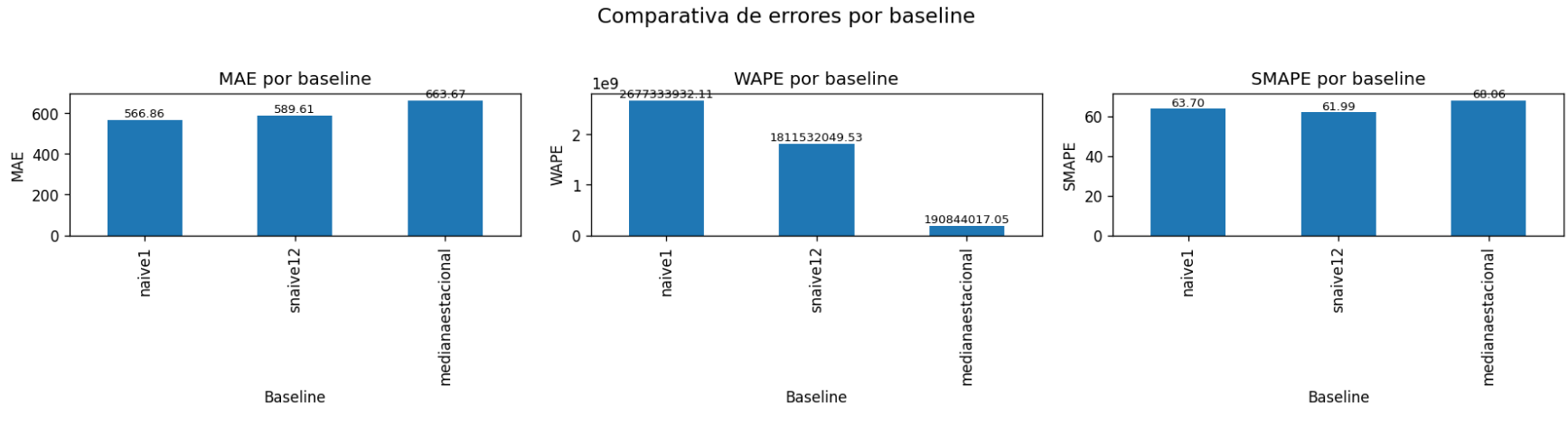 En primer lugar, se calcularon los modelos de referencia o baselines (Paso 1) que sirven para fijar el champion, concretamente Naive(1), SNaive(12) y la Mediana Estacional. Su función era establecer un suelo mínimo de rendimiento contra el que cualquier modelo candidato debía ser comparado. El candidato elegido fue SNaive(12).