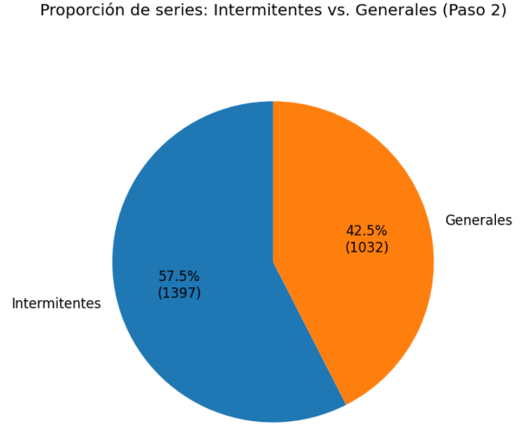 A partir de ahí se llevó a cabo una segmentación dual de las series (Paso 2), distinguiendo entre intermitentes y generales. Esta clasificación se realizó mediante la métrica de rachas máximas de ceros, determinándose que el 57,5 % de las series eran intermitentes y debían abordarse con modelos especializados como Croston, TSB o ADIDA, mientras que el 42,5 % restante se trató con algoritmos de tipo ETS, ARIMA o Theta.