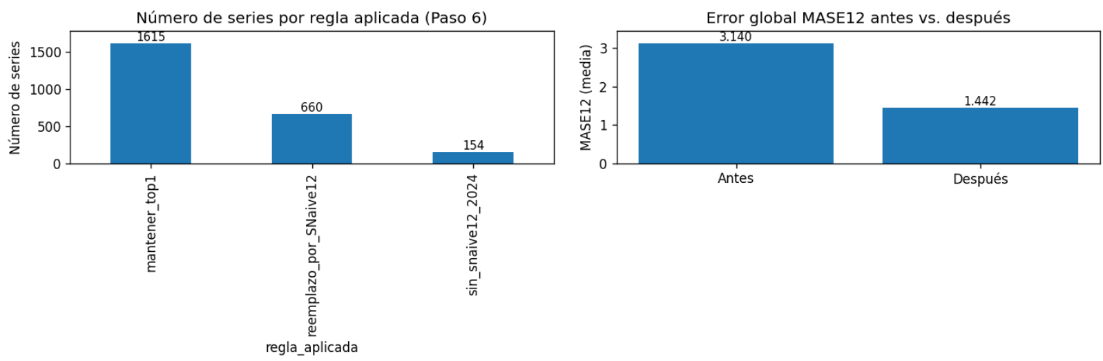 Con los candidatos seleccionados se procedió al reentrenamiento con todo el histórico 2021–2023 y a la combinación del Top1 y Top-2 mediante reglas 50/50 o ponderadas (Paso 5), generando así las previsiones completas para el año 2024. Este mecanismo se complementó con la existencia de fallbacks hacia SNaive12 o incluso hacia el baseline_cero en caso de que una serie no pudiera ser cubierta por modelos más complejos, garantizando así la cobertura total del universo de series.