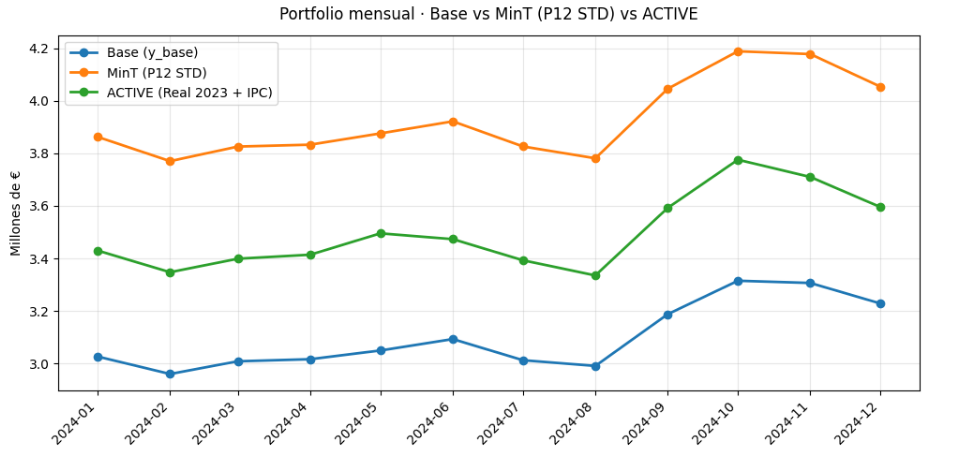No obstante, se decidió que la versión de producción activa debía alinearse con los criterios de negocio. Por ello se introdujo un anclaje basado en el Real 2023 escalado por IPC (Paso 12), asegurando la consistencia estructural de las cifras a pesar de mostrar métricas ligeramente peores que la reconciliación MinT pura.