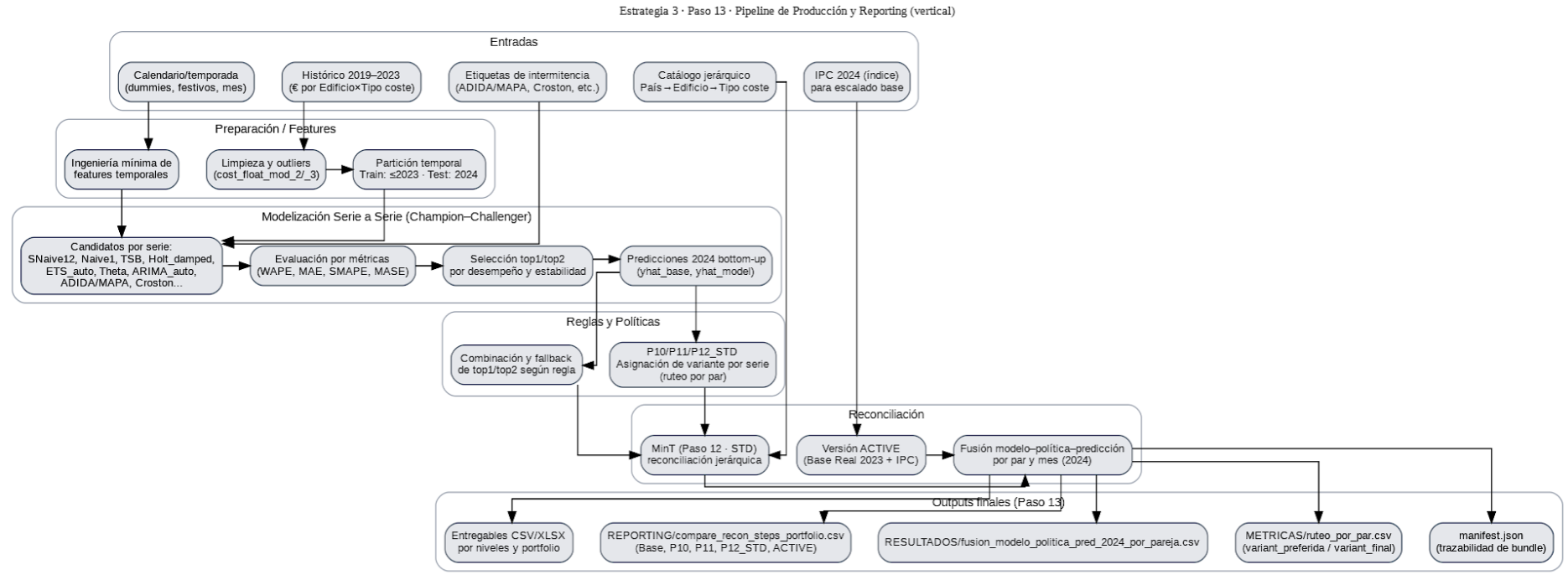 Finalmente, el proceso culminó con la entrega y gobernanza final (Paso 13). Se preparó un paquete de resultados que incluía las previsiones reconciliadas (fusion_modelo_politica_pred_2024_por_pareja.csv), métricas de validación y un fichero de manifiesto (manifest.json) que recogía la trazabilidad completa de las políticas aplicadas, incluyendo P10, P11 y P12. Este cierre permitió disponer de un producto auditable y transparente, con una hoja de ruta clara para la evolución futura del sistema de previsión.
