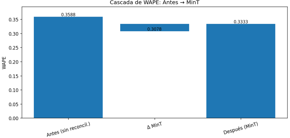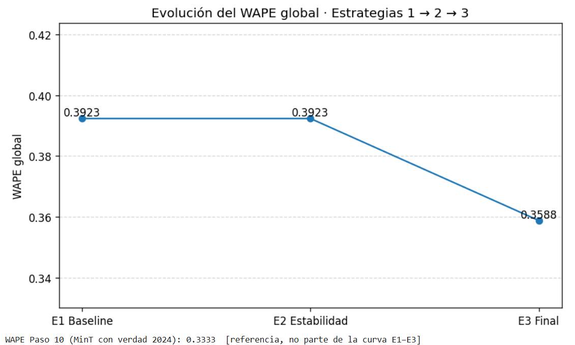 El Paso 10 (MinT con verdad 2024), que no aparece en la línea porque es un ejercicio offline, mostró un WAPE aún menor (0.3333). Eso confirma que la reconciliación funciona muy bien con acceso a la realidad, aunque en producción el resultado consolidado fue el 0.3588.