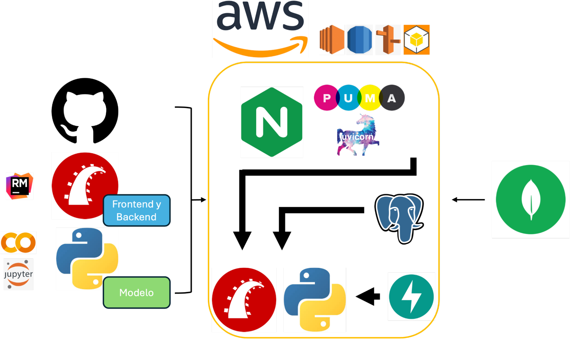 Todo el ecosistema se encuentra orquestado sobre una instancia EC2 de Amazon Web Services (AWS), asegurado mediante TLS con certificados SSL (HTTPS) y servido por NGINX configurado para enrutar las solicitudes adecuadamente entre los distintos servicios. PostgreSQL es utilizado como base de datos transaccional en la capa Rails, mientras que Uvicorn y Puma se encargan de levantar los servidores correspondientes para FastAPI y Rails respectivamente. Se implementaron prácticas de seguridad de red con grupos de seguridad de AWS, y se consideró el uso de UFW para el firewall a nivel de sistema operativo. El control de versiones y la colaboración en el código se realizaron a través de GitHub. Esta arquitectura no sólo garantiza escalabilidad y seguridad, sino que permite una clara separación de responsabilidades entre la capa de presentación, los servicios de procesamiento y la lógica de negocio. Para minimizar la complejidad de lo expuesto anteriormente en esta sección, nuestra arquitectura full stack se demuestra en el siguiente esquema: